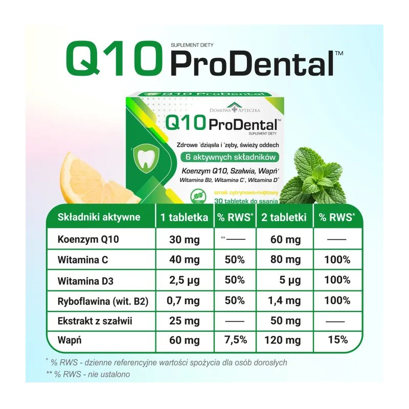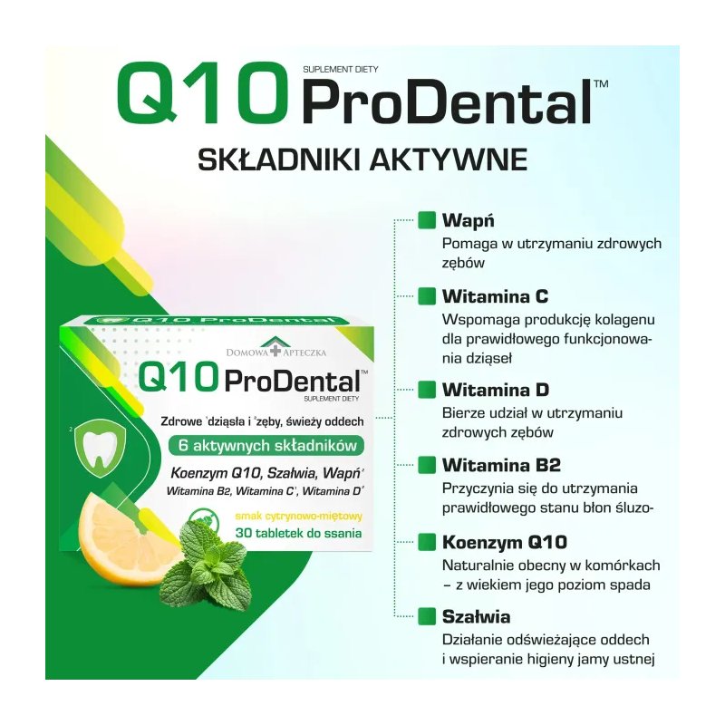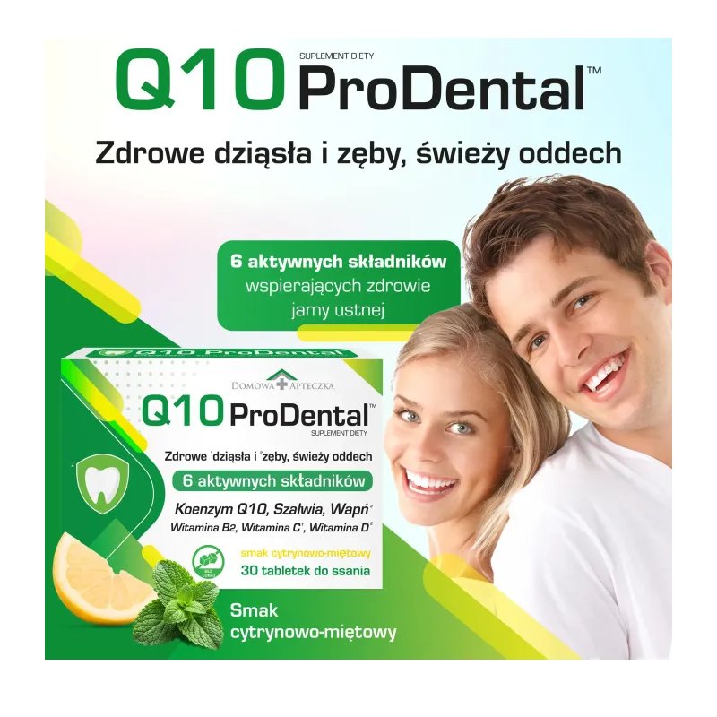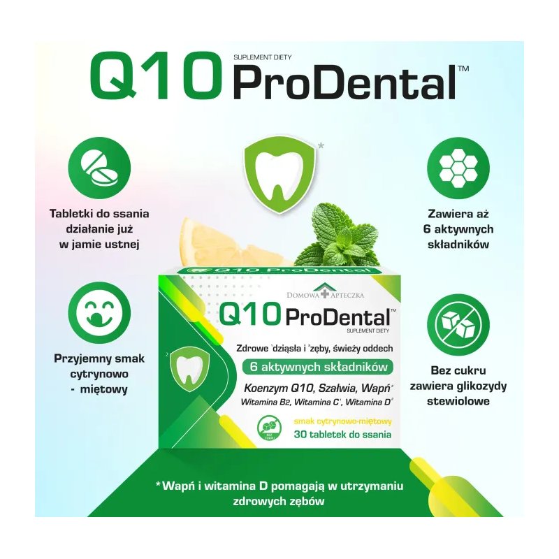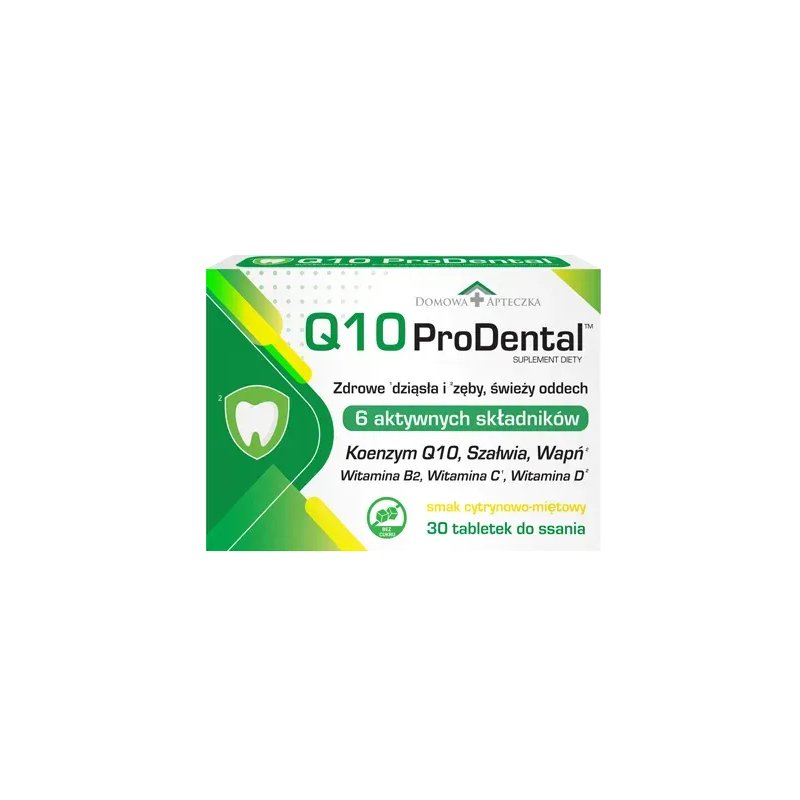 Q10 ProDental to suplement diety w formie tabletek do ssania opracowany z myślą o wsparciu zdrowia dziąseł, zębów i błon śluzowych jamy ustnej. Formuła zawiera zestaw sześciu składników aktywnych: koenzym Q10, ekstrakt z szałwii lekarskiej, wapń, witaminę C, witaminę D3 oraz witaminę B2, które wspólnie wspierają prawidłowe funkcjonowanie jamy ustnej i przyzębia.
